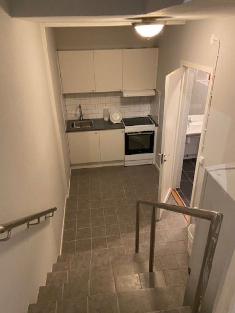 Mindre 2:a med öppen planlösning på markplan. Trappavsats ner till kök & badrum. El & värme ingår i hyran.