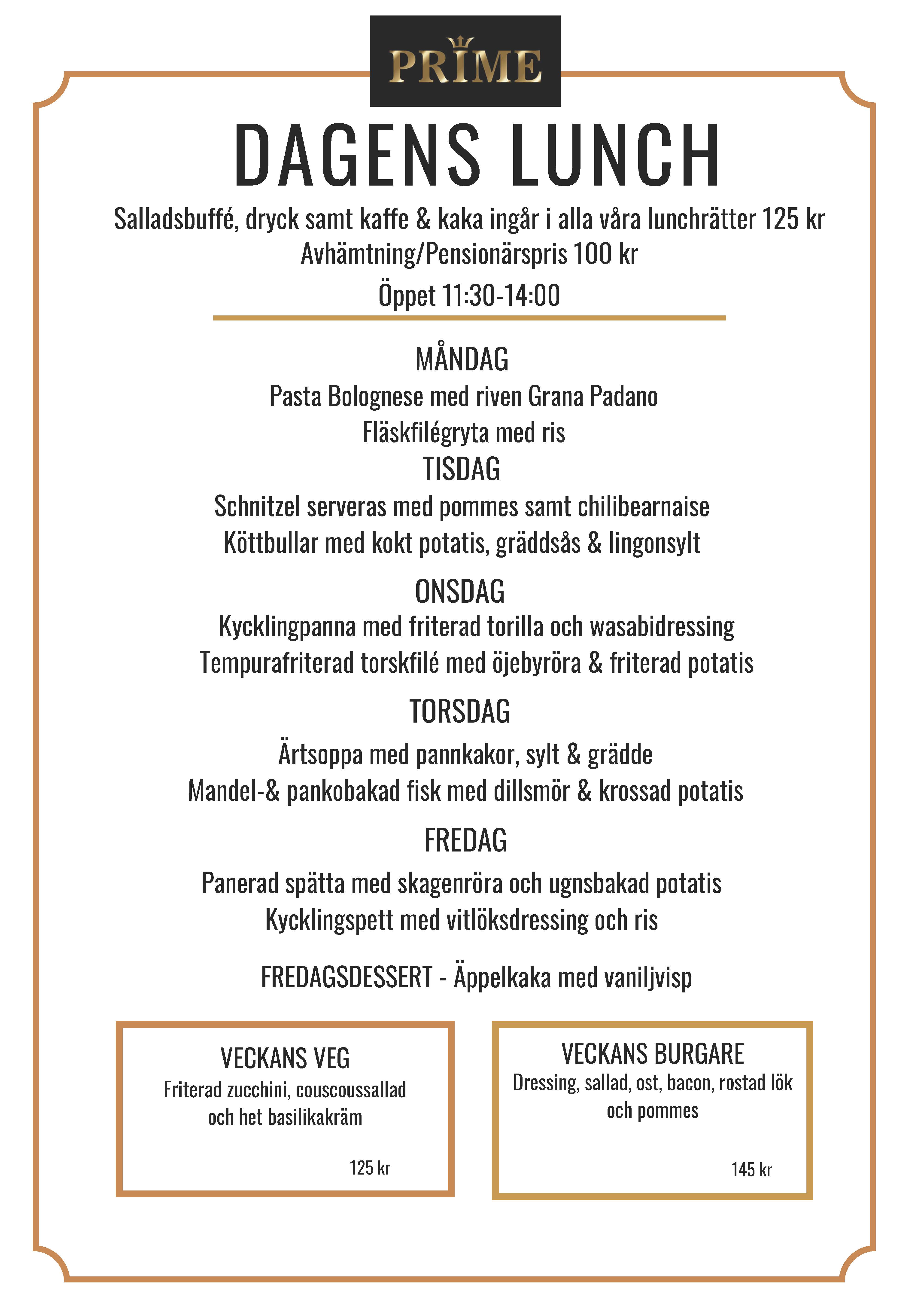 I lunchpriset ingår salladsbuffé, bröd, dryck, kaffe & kaka.Varje fredag serverar vi fredagsdessert